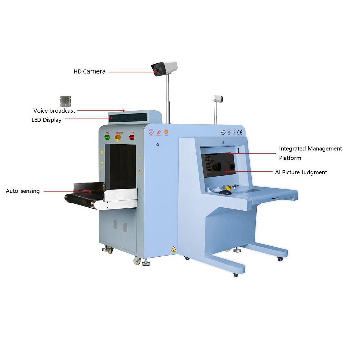 X-Ray Smart Baggage Scanner equipped with HD camera, voice broadcast, LED display, AI picture judgment and integrated management platform